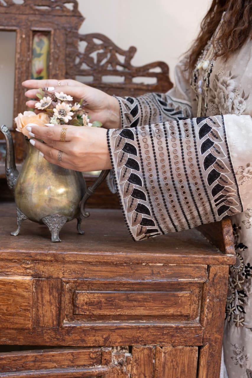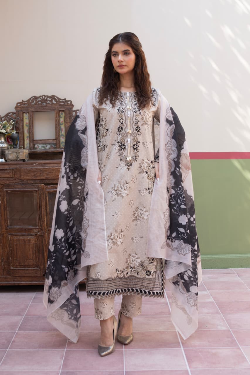 Cambric cotton 3-piece ensemble, featuring a soft beige base adorned with intricate black and ivory floral embroidery. The shirt showcases delicate threadwork and subtle embellishments on the neckline for a refined touch. Paired with matching embroidered trousers and a contrasting printed dupatta in monochrome tones, this outfit combines comfort, elegance, and timeless appeal — perfect for casual gatherings or semi-formal occasions.