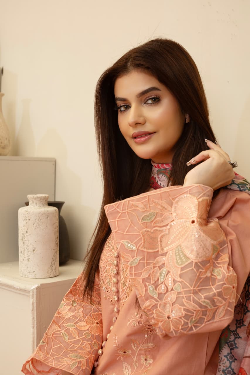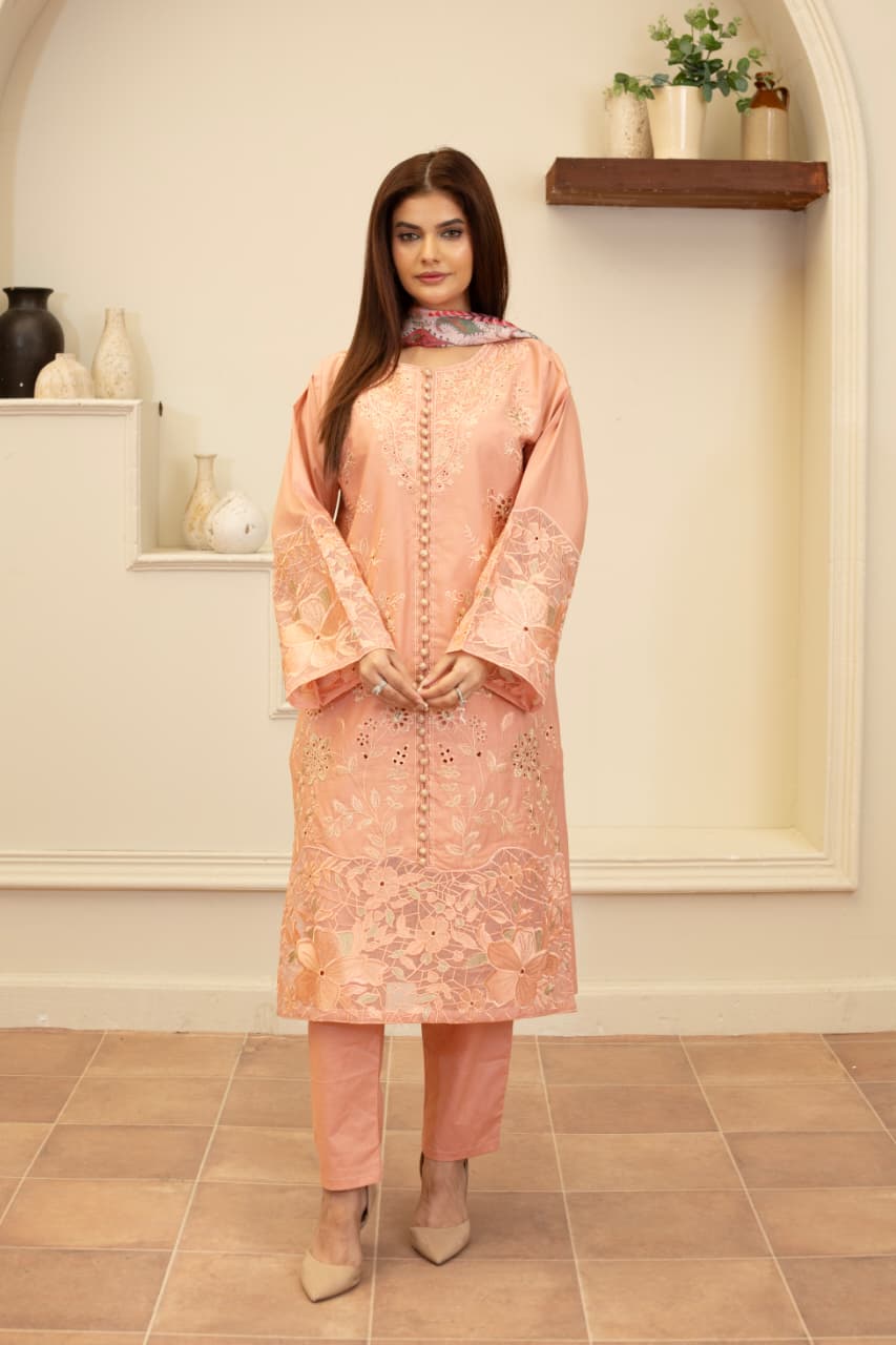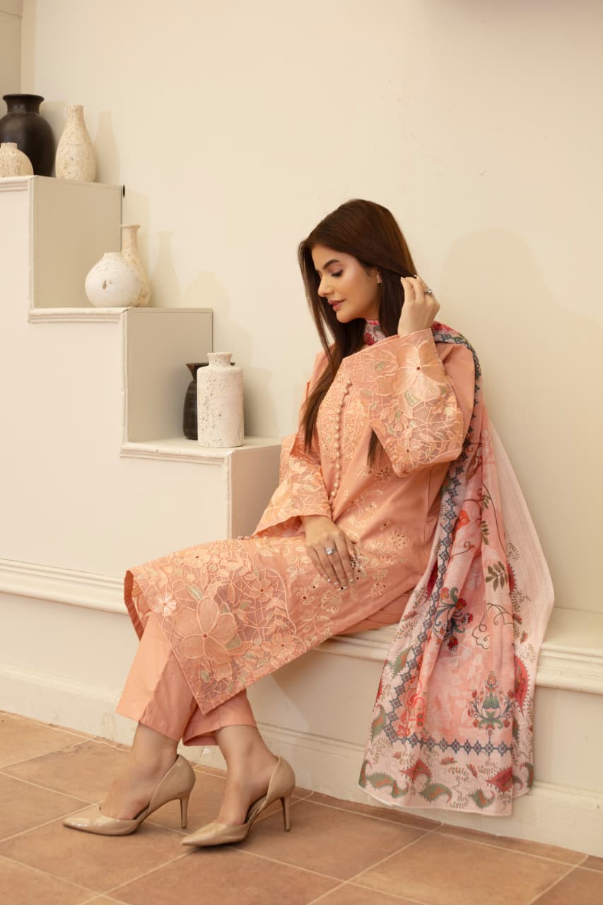 Elevate your wardrobe with this Blush Peach Cambric Cotton Embroidered 3-Piece Suit, crafted for timeless elegance and comfort. The soft cambric cotton fabric is beautifully adorned with intricate embroidery and delicate cutwork detailing on the front and sleeves. Its floral patterns add a graceful charm, while the printed chiffon dupatta enhances the outfit with a touch of artistry. Paired with matching cambric trousers, this ensemble is perfect for casual gatherings, festive occasions, or everyday chic wear.