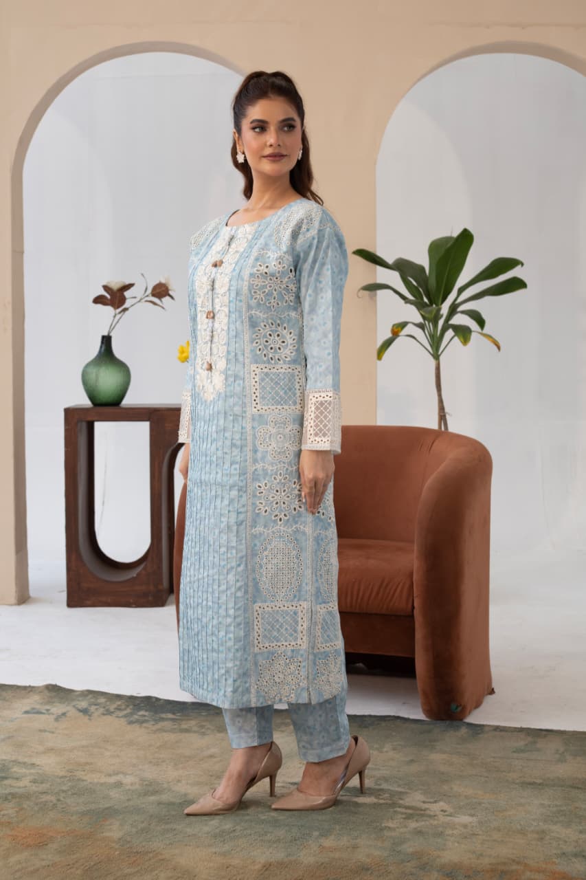 Designed for the woman who loves effortless sophistication. This outfit features intricate embroidery on soft Cambric cotton fabric, highlighted with delicate lacework and subtle handcrafted details for a refined touch.