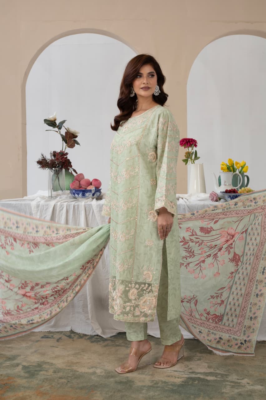 Made from breathable cambric cotton, the outfit keeps you comfortable all day long while maintaining a refined, elegant look. The long embroidered shirt pairs effortlessly with matching trousers, and the floral printed dupatta adds a touch of flow and color to complete your look.
