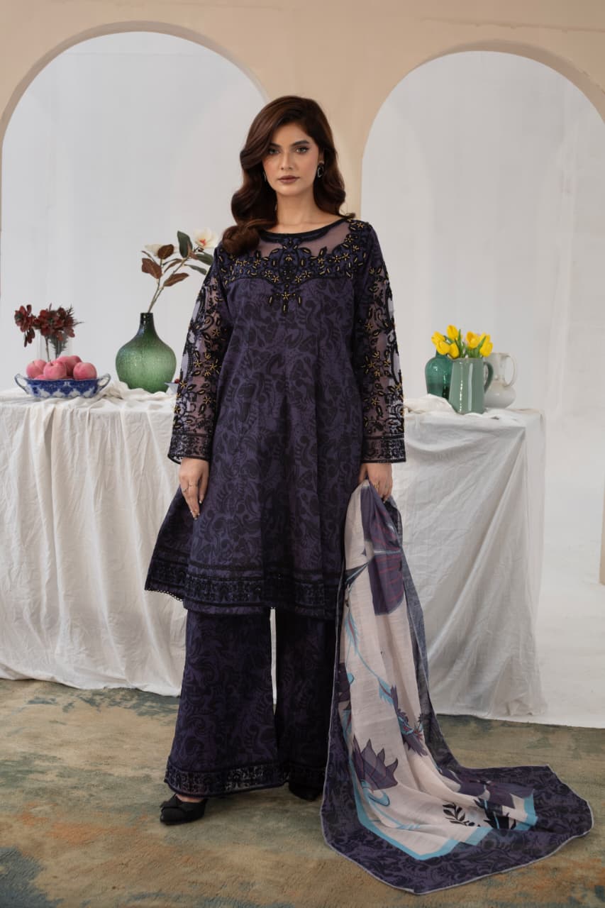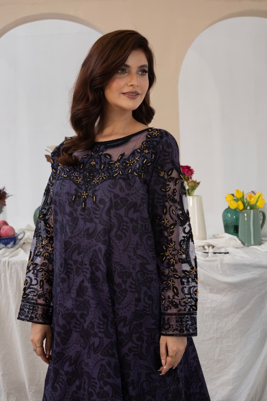 The long shirt pairs beautifully with wide-leg trousers, offering comfort without compromising on style. A printed dupatta with floral accents adds the perfect finishing touch — light, graceful, and beautifully balanced.