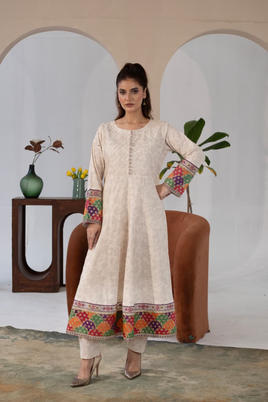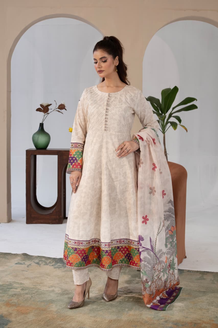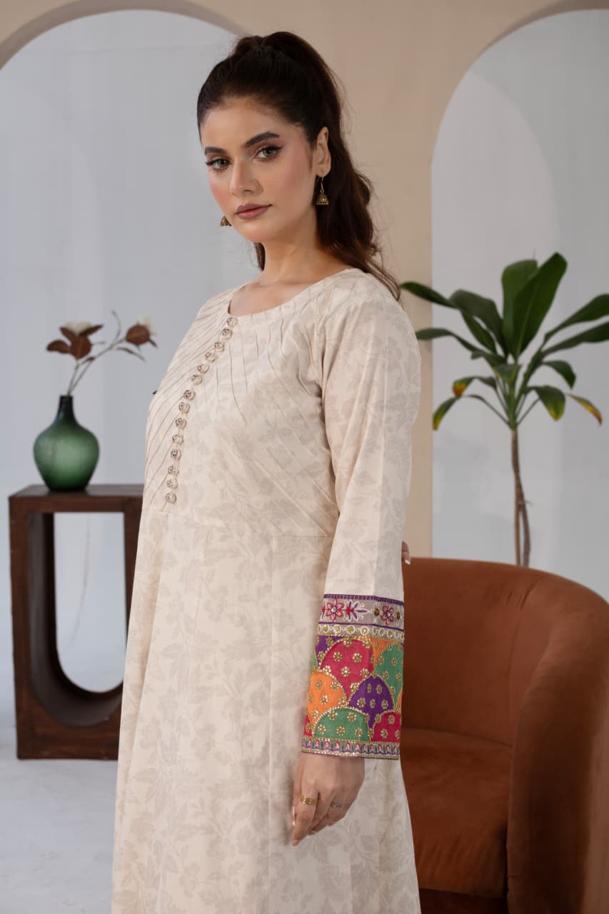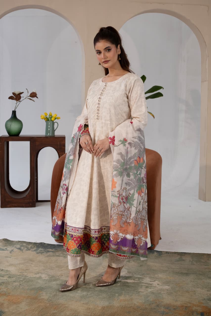 The long shirt pairs beautifully with wide-leg trousers, offering comfort without compromising on style. A printed dupatta with floral accents adds the perfect finishing touch — light, graceful, and beautifully balanced.