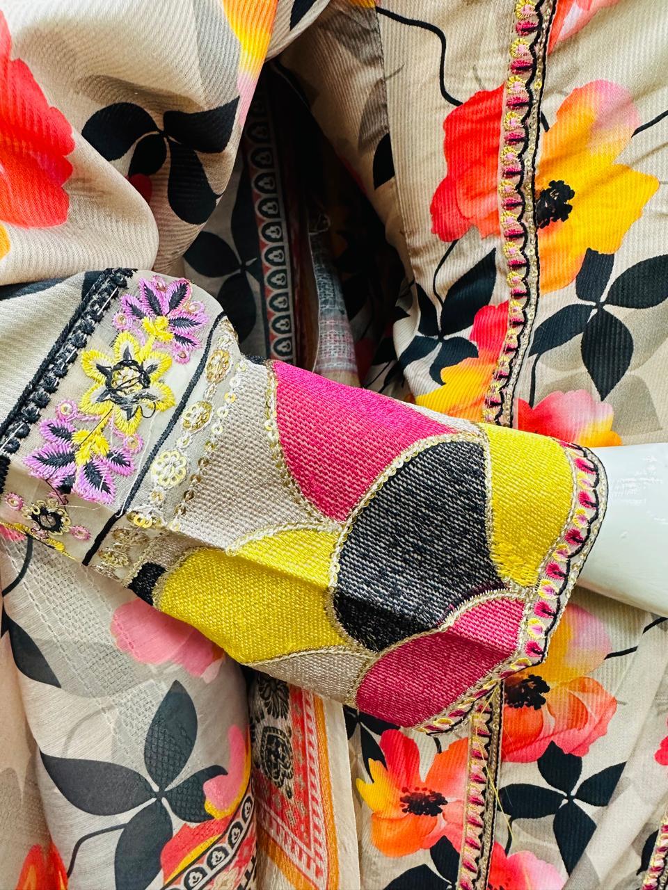 Unveil your vibrant side with this Contraya Fabric 3-Piece Suit, designed to radiate energy and elegance. The outfit showcases a soft beige base beautifully adorned with bold floral prints in red, yellow, and black hues, creating a perfect fusion of tradition and modern charm. The neckline is enhanced with intricate thread embroidery, while the border and sleeves carry detailed printed motifs for an elegant finish. The matching trousers and digitally printed dupatta complete the look with harmony and grace — ideal for festive casual wear or daytime gatherings.