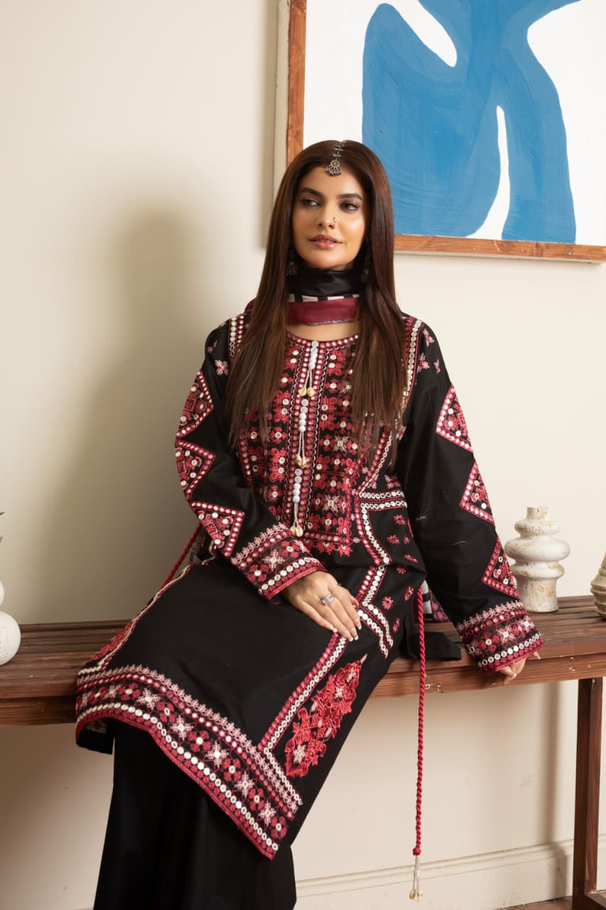 Crimson Charm from our latest Cambric Collection. This striking black cambric 3-piece suit features rich maroon and crimson embroidery, exuding elegance with a bold traditional flair. The shirt showcases intricate threadwork along the neckline, sleeves, and borders, enhanced with geometric and floral patterns that add a refined depth to the design.