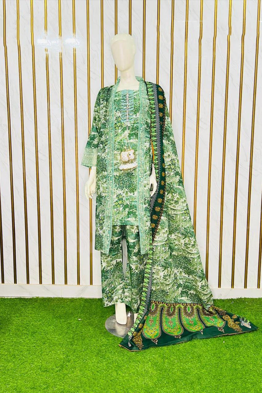Step into winter elegance with our Emerald Grove ensemble — a beautifully designed 3-piece ready-to-wear khaddar suit. Crafted from soft, premium khaddar fabric, it features intricate embroidery that enhances its forest-inspired print. The matching printed trouser and contrast dupatta add a rich touch of sophistication, perfect for cozy winter days or festive evenings.