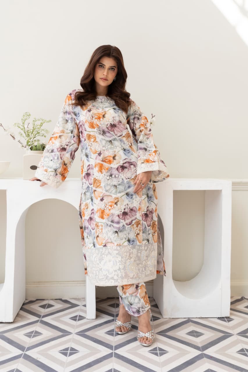 Floral Mist Cambric Cotton 3-Piece Ready-to-Wear Suit, designed for comfort and style in every season. Made from premium cambric cotton, this outfit features a beautiful floral printed shirt with soft pastel tones and lace detailing, coordinating printed trousers, and a stunning multicolor printed dupatta that adds a luxurious touch.