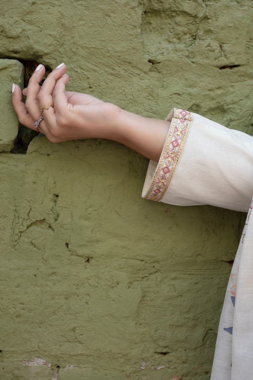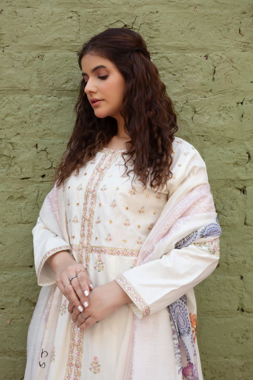 Ivory Cambric cotton frock-style 3-piece suit, featuring delicate pastel floral embroidery and intricate border detailing. The long frock silhouette enhances femininity with its graceful fall and soft texture. It is paired with straight trousers for a refined look and a digitally printed Cambric dupatta adorned with subtle hues and paisley accents. This ensemble blends classic charm and modern sophistication, ideal for daytime events or festive gatherings.