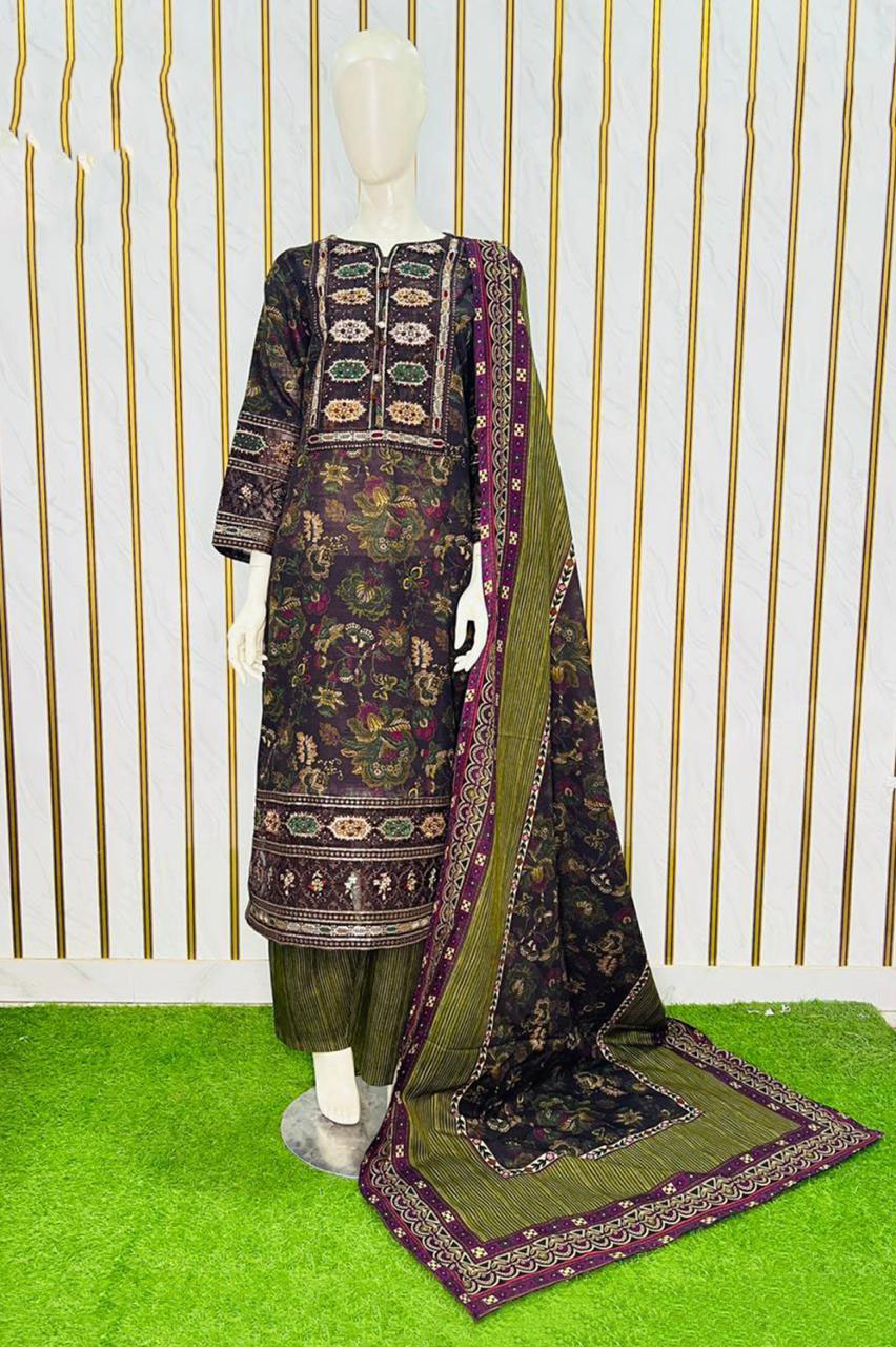3-piece khaddar suit features a beautifully printed shirt with floral motifs and intricate borders. The shirt comes with a matching printed trouser in a zig-zag pattern, paired with a fully printed dupatta that completes the winter look. Soft, warm, and breathable khaddar fabric makes it perfect for chilly weather while maintaining a stylish and graceful appearance.