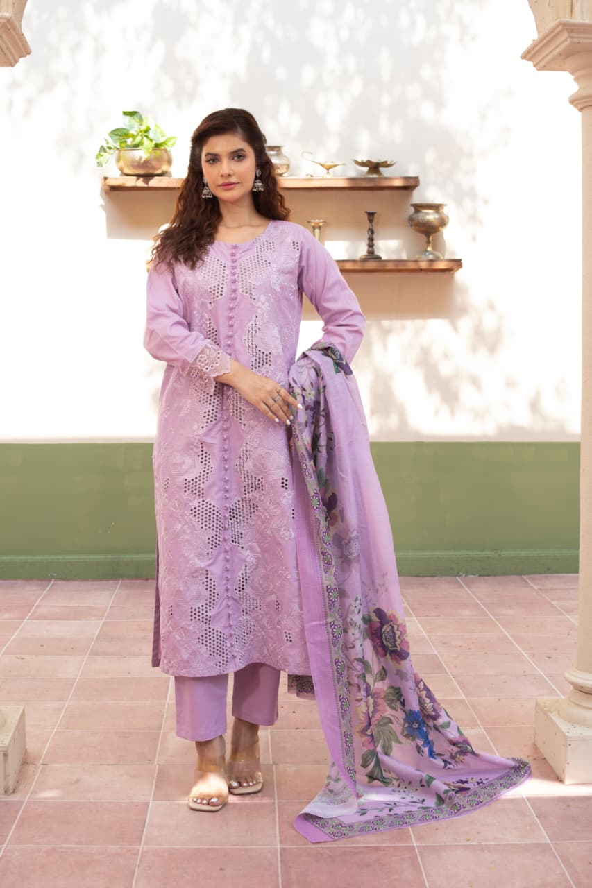 Grace your wardrobe with this ready-to-wear 3-piece cambric cotton ensemble in a soft lavender shade. The shirt features exquisite thread embroidery with delicate cutwork detailing, adding a refined and feminine charm. The straight silhouette and subtle embellishments make it perfect for both everyday elegance and semi-formal wear.