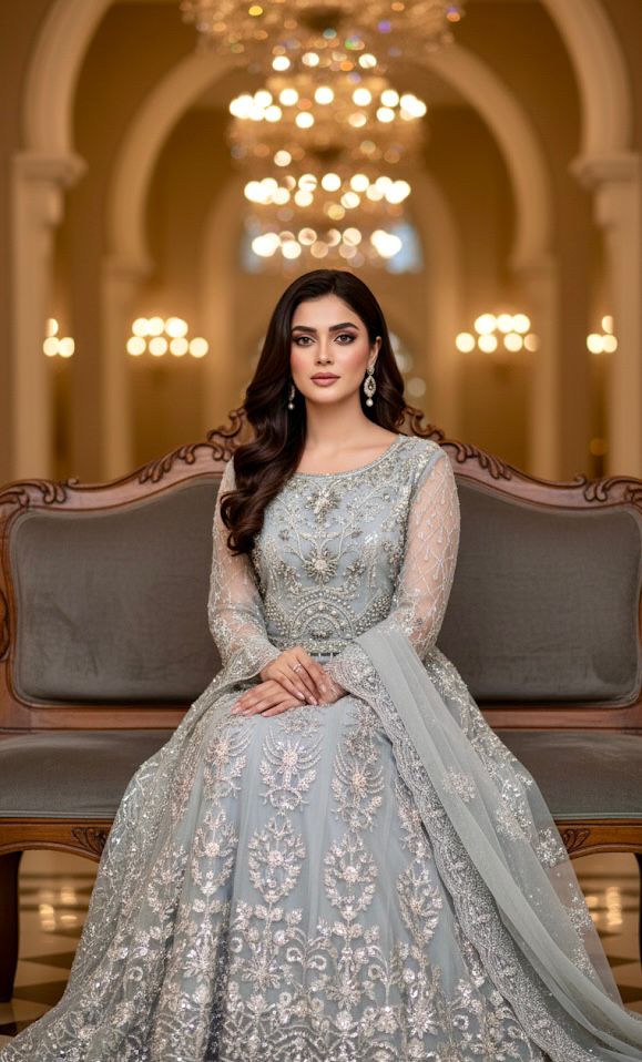 a masterpiece of artistry and sophistication. This exquisite outfit is adorned with delicate crystal and pearl handwork, crafted meticulously by skilled artisans.