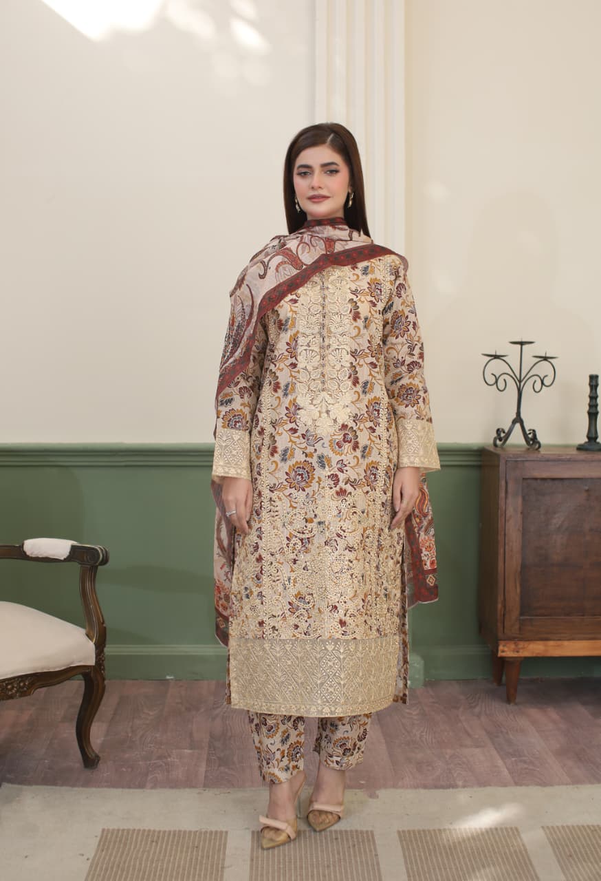 Luxury Embroidered Winter 3-Piece Suit crafted in premium cambric fabric, designed to bring elegance, comfort, and sophistication to your seasonal wardrobe. This outfit beautifully blends traditional artistry with modern finesse, making it a perfect choice for winter gatherings, family dinners, casual events, and formal daytime occasions.