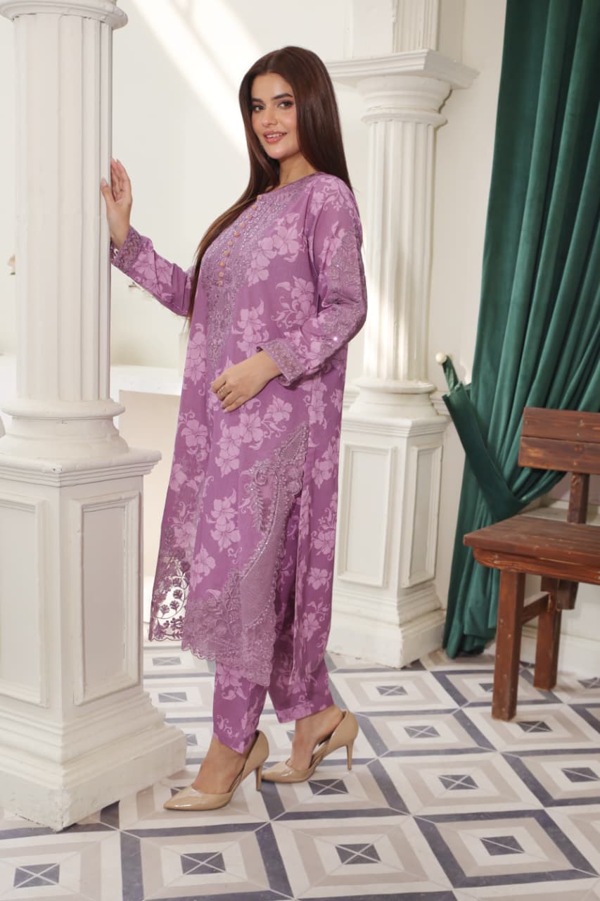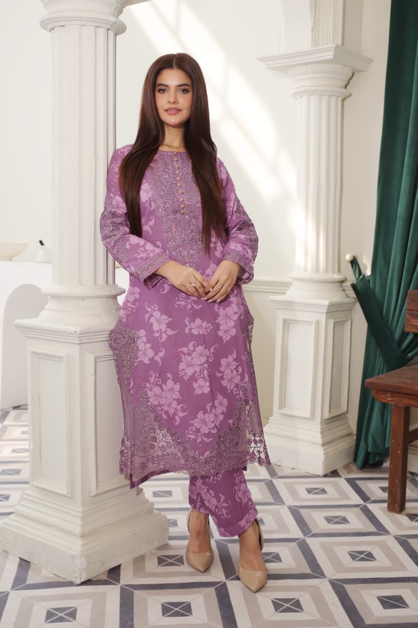 Mauve Cambric Embroidered Suit Printed Dupatta