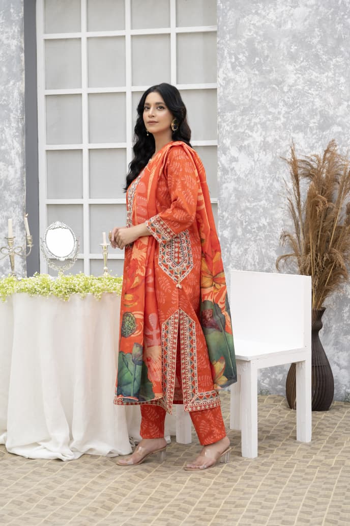 Elevate your winter style with this burnt orange Contraya 3-piece suit, beautifully crafted for warmth and elegance. The embroidered neckline and sleeves add a touch of sophistication, while the soft Contraya fabric ensures comfort during chilly days. Paired with a vibrant printed dupatta, this outfit blends traditional charm with modern design—perfect for both casual and festive gatherings.