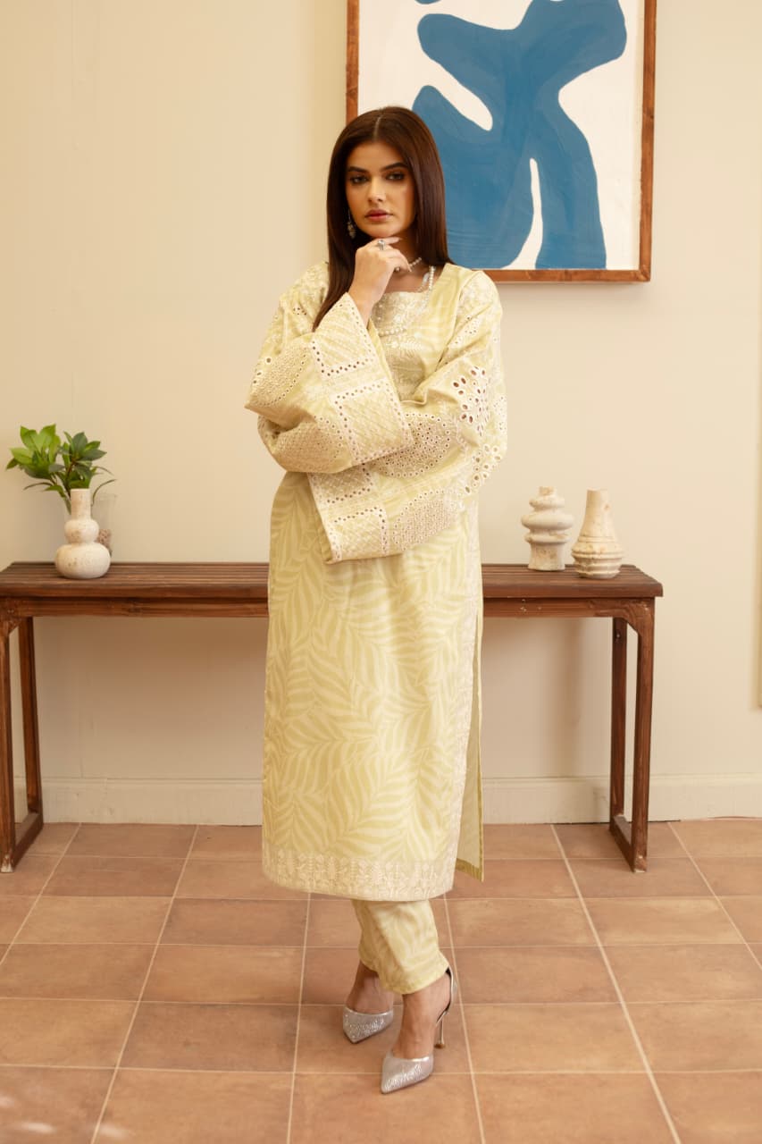 Exude timeless grace with this Pastel Cream Cambric Cotton Embroidered 3-Piece Suit, designed for those who appreciate understated elegance. Crafted from soft cambric cotton, the shirt features delicate embroidery and intricate cutwork on the sleeves and front panel. The soothing cream base is adorned with subtle leafy patterns, giving it a refined and fresh look. Paired with matching trousers and a beautifully printed chiffon dupatta with soft floral motifs, this outfit is perfect for daytime events, festive gatherings, or graceful everyday wear.