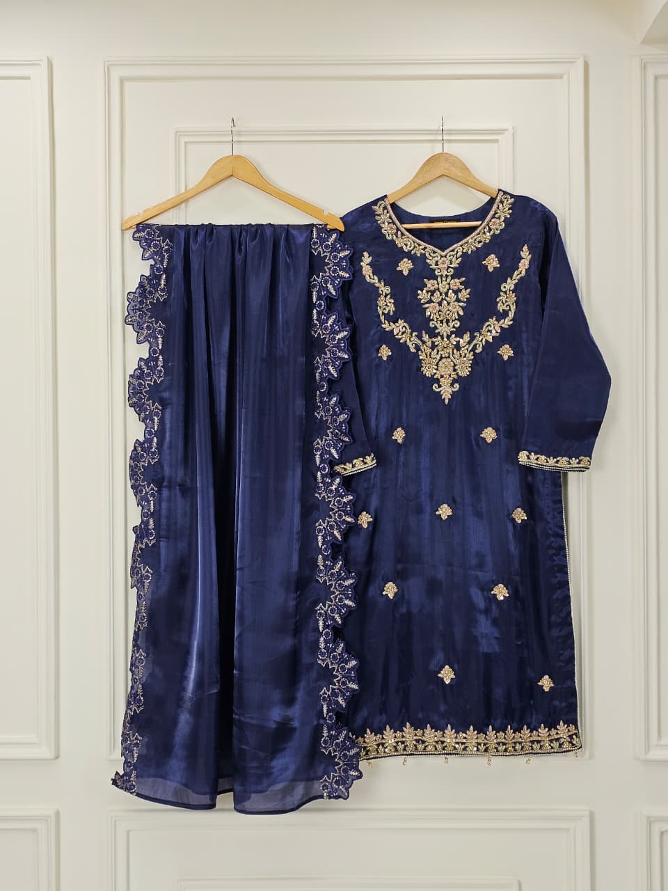 royal blue 3-piece outfit features handmade cora dabka embroidery that adds a touch of timeless luxury. Crafted on premium silk fabric, the shirt showcases intricate golden thread and beadwork, paired with an embroidered dupatta and plain dyed trousers. Perfect for festive occasions, weddings, or evening gatherings, this outfit brings traditional artistry together with modern elegance.