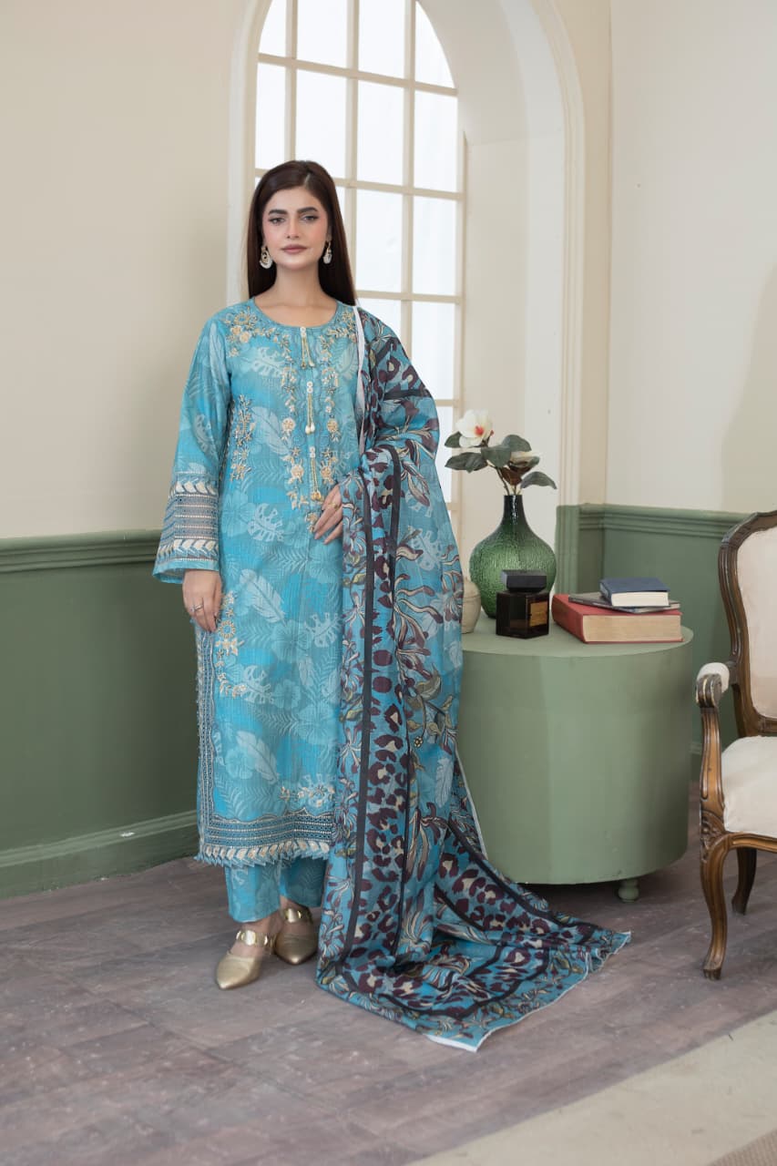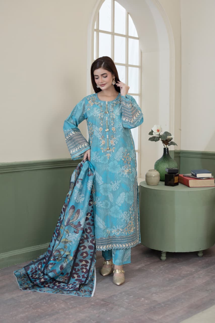 Step into winter with elegance in this stunning Turquoise Cambric Cotton 3-Piece Ready-to-Wear Suit, designed for comfort, colour, and charm.